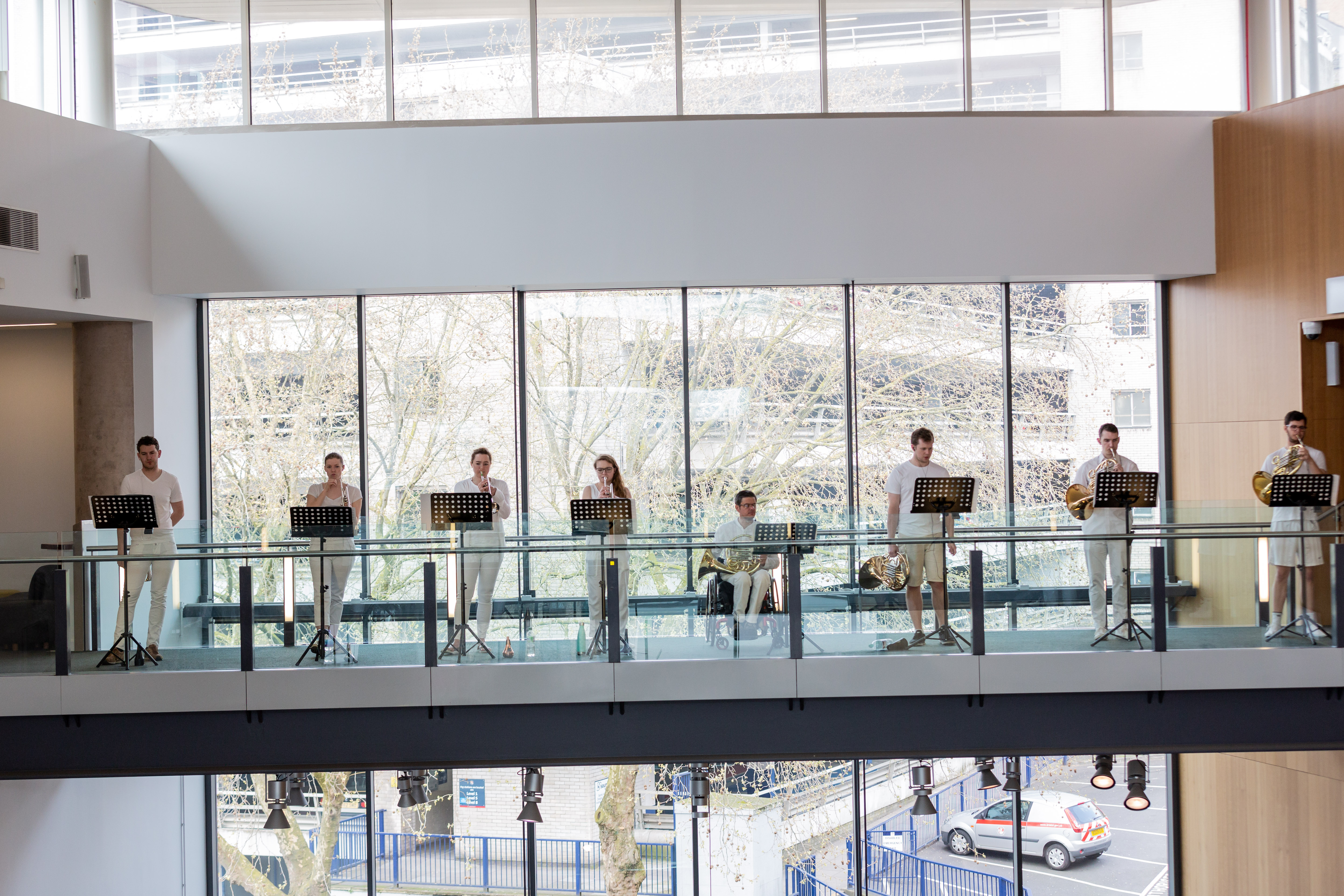 Instead of the usual orchestral formation, the players were dispersed throughout the glass-fronted atrium's four open levels, mixed in with the audience. Never mind the fourth wall, I'm not sure this performance had a third or second either…