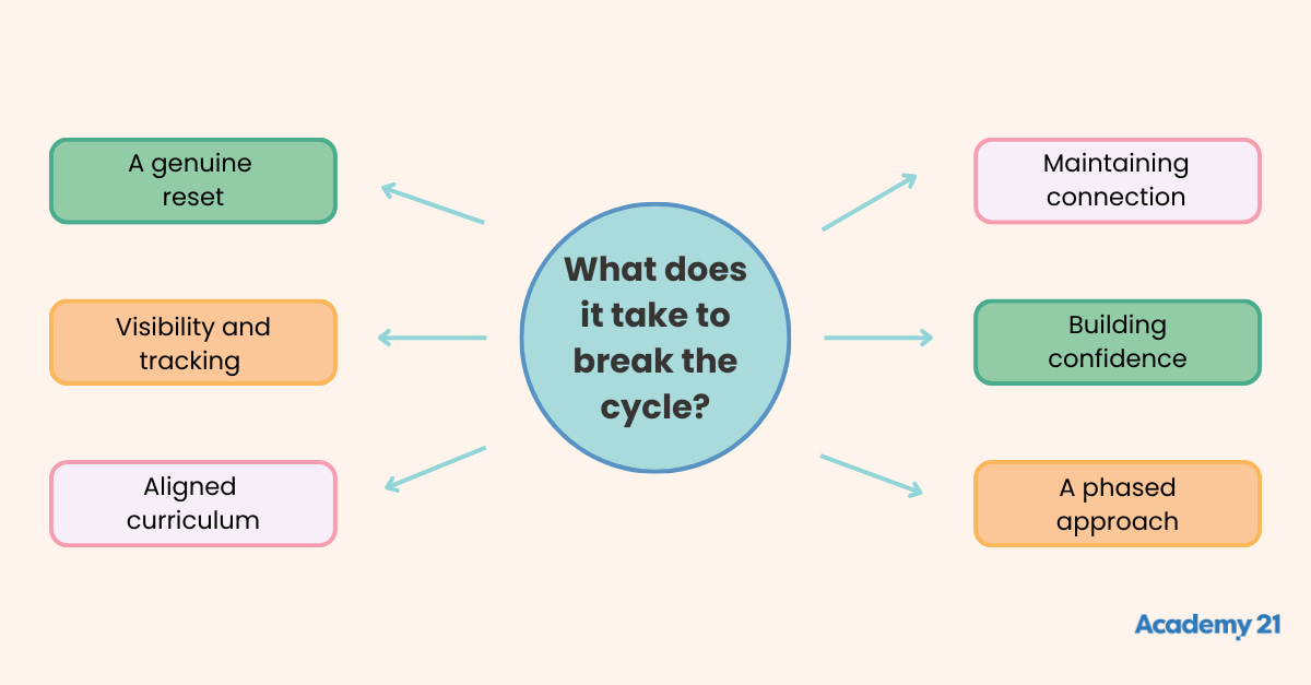 “Breaking the cycle” refers to interrupting or overcoming patterns of disengagement or absenteeism that can persist over time. These cycles often stem from various factors, such as repeated academic setbacks, behavioural issues, lack of support, or socio-emotional challenges.